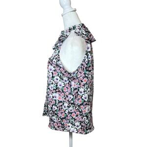 Beautiful and feminine crepe floral blouse from Anthropologie. This top features a button-down front and halter-style neckline (v-neck) with a ruffled collar in front and back. The sleeveless top has lovely flowers in shades of purple and pink with accents of green, black, and orange.