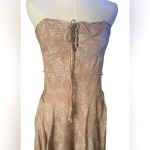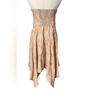 This stunning strapless dress by Anthropologie features an asymmetrical hemline and a bustier design, perfect for wedding guests or cocktail events. The tan and gold hues add a touch of elegance, while the sleeveless, sundress style ensures a comfortable and chic fit.