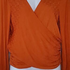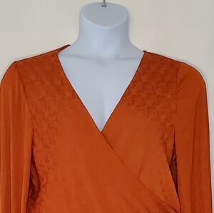 By Anthropologie Crossover Top Size XL. Silky smooth, soft, surplice pullover top in a rust orange with a subtle floral design.