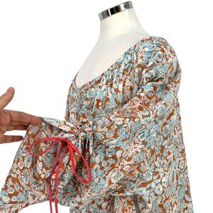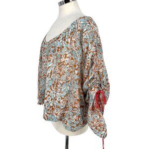 By Anthropologie Floral Long-Sleeve Shirred Blouse Brown Blue Size Large