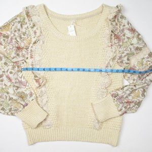 By Anthropologie Printed-Sleeve Ruffle Sweater in the color cream - an off-white / yellow-tone cream (sort of a cornmeal shade). Size women's large.