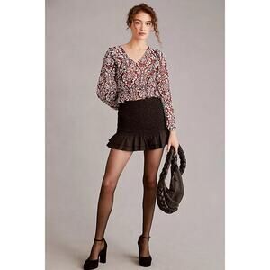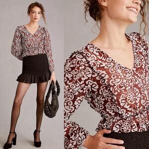 By Anthropologie Jacquard Peasant Blouse Women's Blouse Wine M Ruffle Peplum