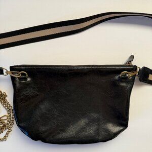 Anthropologie Cross Body Black Handbag. Has two handle options and two zipper pouches. In excellent conditions. The front pouch is suede and the back pouch a fauz leather. One handle is a cute black and white stripe and the other a gold chain. You could put the two together.Overall size is 12" x 8".