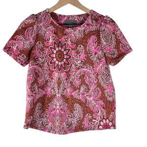 By Anthropologie Pink Demeter Paisley Short Sleeve Tee. Paisley botanical motifs. Round neckline. Pullover. Metallic threading. Pink brown. Polyester, nylon, metallic blend. Size XS. Armpit to armpit: 16.5". Length: 21.5". (726)