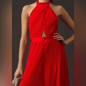Chic red halter jumpsuit with flowing wide legs. Perfect for stylish outings. This jumpsuit is new with tags, never worn, no flaws. Please see photos for further detail and measurements.