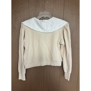 By Anthropologie Poplin-Collar V-Neck Sweatshirt XS Beige White Cropped Smocked