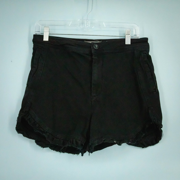 By Anthropologie Size 8 Black Ruffled Ultra High Rise Button Zip Denim Jean Shorts
