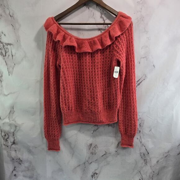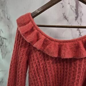 By Anthropologie Sweater Women Small Salmon Coral Wool Ruffle Off Shoulder