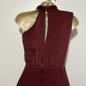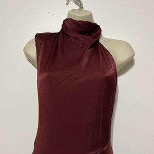 Style: Party, cocktail, avant garde, romantic goth, dark romance, ethereal, event, one shoulder, flowy skirt, satin & chiffon, dark burgundy, mock neck, handkerchief hem,
