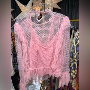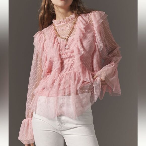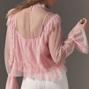 By Anthropologie Sheer Ruffle Blouse in Pink NWOT