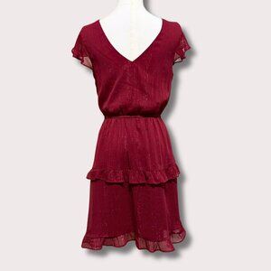 Gorgeous By & By dress in a rich burgundy wine color with subtle metallic shimmer throughout the fabric. Size small. Features flutter sleeves, a flattering V-neckline, adjustable tie waist, and romantic tiered ruffle hem. Lightweight and fully lined with no flaws noted. Perfect for holidays, date nights, or special occasions.