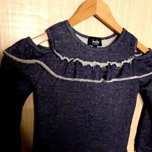 By & By girl’s blue cold shoulder raw hem, sweatshirt medium 10-12. Gently used condition. Measurements are: 20” from shoulder to hem, and 15” from armpit to armpit.