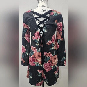 By & By Long Sleeve Floral French Terry Swing Dress Corset Back Size Small NWT