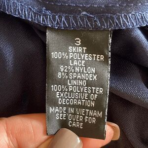 Material: SKIRT 100% Polyester LACE 92% Nylon 8% Spandex LINING 100% Polyester