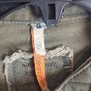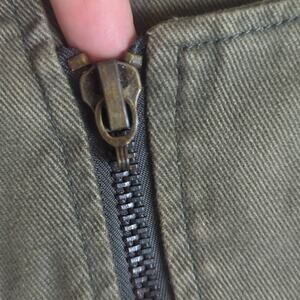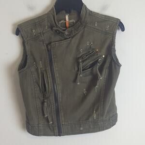 Great condition. naturally distressed army green cropped jacket vest. The front zipper is missing the tag pull but the zipper works! Three front zipper pockets. button, neck and adjustable buttons on waistline