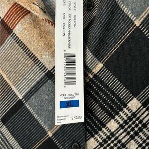 New with tags By Design plaid soft knit collared blouse with roll tab mid length sleeves. Beautiful autumn colors of black, brown, rust and light tan all blended together in a beautiful plaid print. Black buttons down front. Pit to pit is 22”,