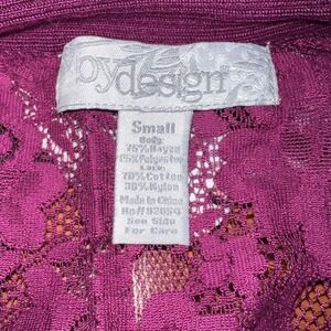 By Design cardigan in rich purple with romantic floral lace inset at back. Open front style with long ribbed sleeves and lightweight knit body. A versatile layering piece perfect for work, casual, or evening wear. Women's size Small.