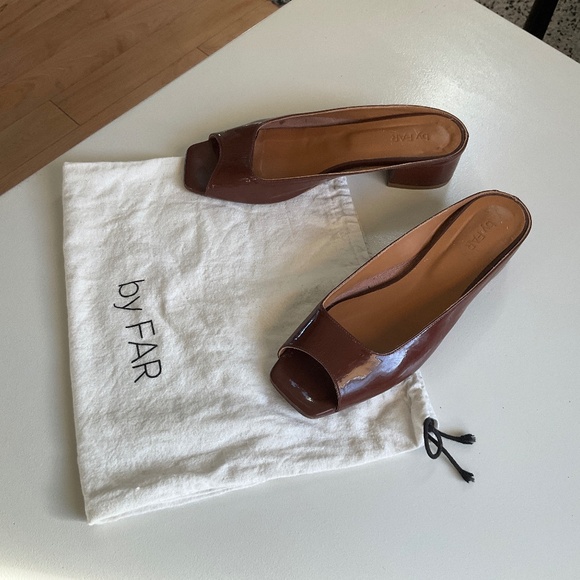 By Far burgundy/ brown patent leather mules, gently used just a few times, comfortable 1.5 inch heel. Lined in leather and real leather sole. Size 40 Italian, approximately a 10 or 9 1/2 American