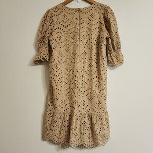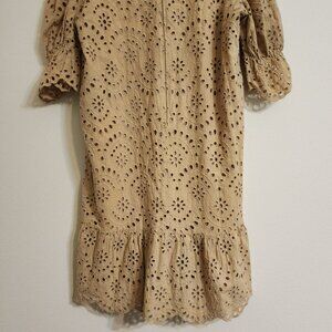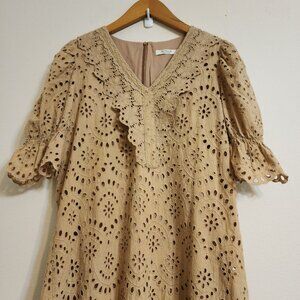 By Flow Mini Dress Eyelet Embroidered Lace Beige V Neck Zip Ruffle Feminine Edgy