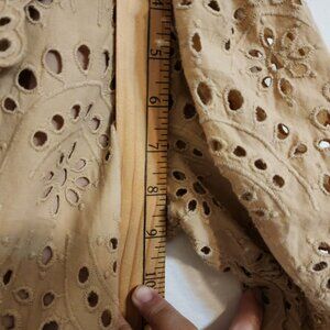 Embrace a touch of feminine flair with the By Flow Mini Dress, a stunning piece that merges the elegance of eyelet embroidered lace with the playful charm of a short silhouette. The beige hue makes for a versatile addition to your wardrobe, easily transitioning from business meetings to evening cocktails. The dress features an elegant V-neck and playful balloon short sleeves, enhancing its romantic character. Designed with comfort in mind, this dress is crafted from breathable cotton and boasts a ruffle accent that adds a whimsical twist to the classic mini length. The zip closure ensures a seamless fit for a regular size M, making it a practical choice for any occasion. Whether you're headed to the beach or a formal event, this dress promises to keep you stylish and comfortable all day long. In Great Pre-Owned Condition.