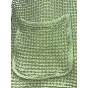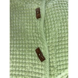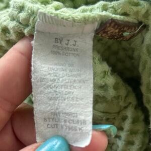 This charming By JJ waffle knit cardigan jacket is a lovely addition to any wardrobe! The light green color is refreshing and versatile, perfect for layering. The wooden buttons add a touch of rustic elegance to the lagenlook style. Note that the very top button is missing.