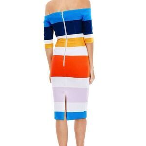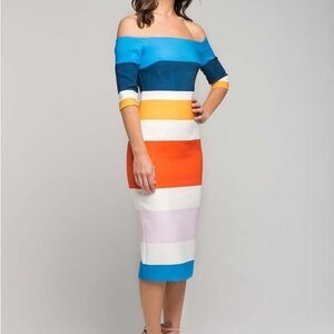 Vibrant off-shoulder dress with bold stripes. Features a mix of colors for a striking look. Perfect for any occasion.