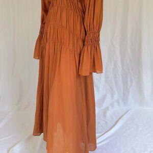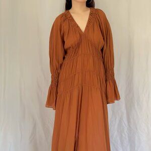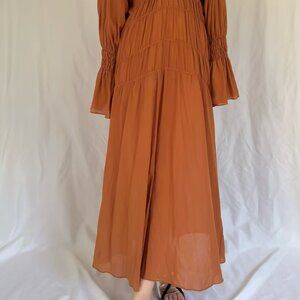 Features smocked, organic cotton, V-neck and bell sleeves. Retail Price $597 USD.