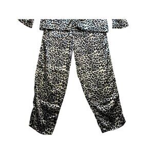 This stylish leopard print pajama set offers comfort and elegance for nighttime relaxation. Designed in extra-large for a relaxed fit, it features a button-down top with matching pants. The polyester material ensures durability and ease of care. Ideal for those seeking both fashion and functionality in their sleepwear.