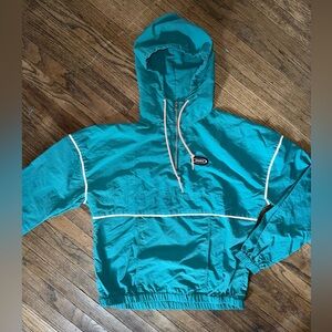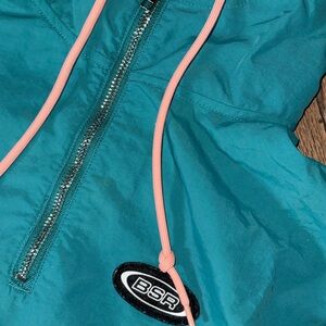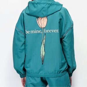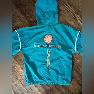 BSR teal windbreaker with reflective strips, quarter-zip front, lightweight design, pink drawstrings, kangaroo pocket in front AND hidden front pocket with zipper. Flower graphic on back with phrase “be mine, forever”. Size M. Perfect condition. NWOT. Great for outdoor wear, casual wear.