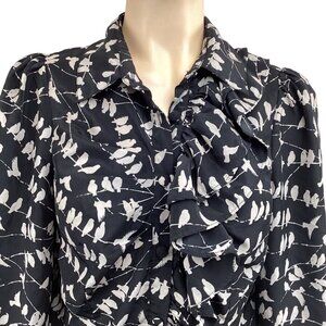 By Stella Black Bird Print Ruffle Blouse Size Small Unique Black & White