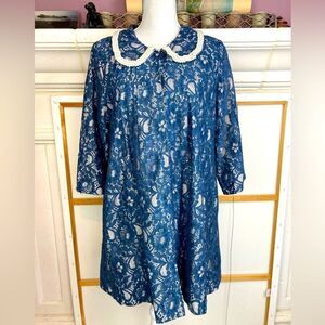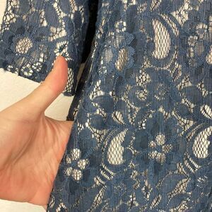 So pretty looks vintage/ retro. Bridgerton vibe. Lace swing coat. Has cadets blue lace over light pink satin lined. Pearl double row trim around collar. Great side pockets and 3/4 sleeves. Frog closure all the way down inside. Perfect for formal, fun or evening. EUC pit to pit 21” closes. Shoulder to hem 33”. Sleeve inner pit to end 13”. All pearls are there.