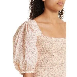 By TiMo Dress Womens Large Cream Pink Mini Ditsy Floral Smocked Ruffle Twee Boho Poplin Coastal Cowgirl Hippie Cottage Fairy Festival Smocked Stretch Puff Sleeve