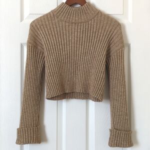 By Together Chunky Ribbed Knit Mock Neck Rolled Cuff Cropped Sweater Tan Small