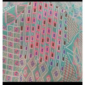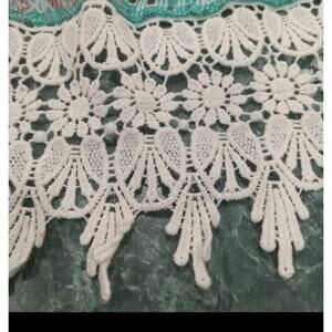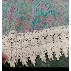 The product is a women's XL crochet bell sleeve boho hippie dress made in the USA by the brand By Together. It features a retro multicolor design with an off-the-shoulder neckline and long bell sleeves, perfect for casual occasions during the summer and spring seasons. The knee-length dress is made of polyester material and is machine washable, making it easy to care for. With its bohemian theme and sheath style, this dress is sure to make a statement for any hippie-inspired outfit.