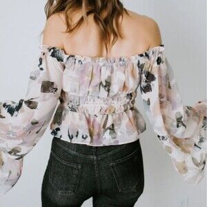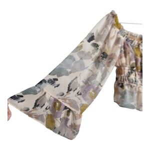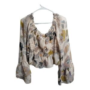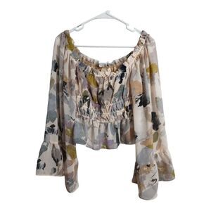 Watercolor Print Peplum top with slight ruffles around the neckline. Smocked waist and elasticized cuffs. Square neck and a bell sleeve.