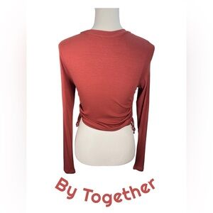 • Ribbed, long-sleeved crop top with drawstring details on the sides, allowing for an adjustable length or gathered look.