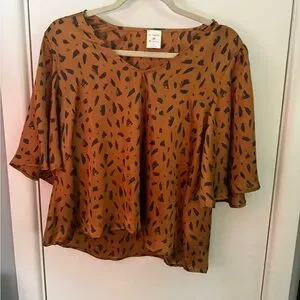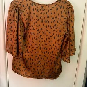 Flowy blouse with abstract black pattern. Short loose sleeves and rounded v neckline. Ideal for casual wear. Lightweight. Great transition piece for fall. Never worn.