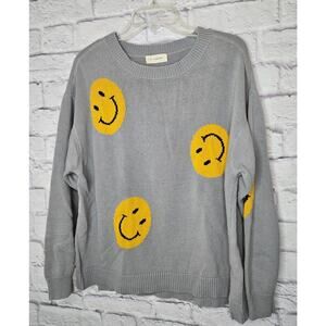 By Together women's smiley face gray yellow pullover crew cotton sweater size small.