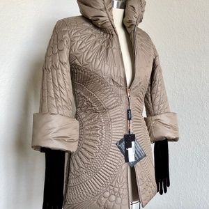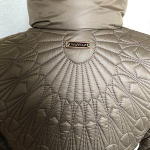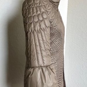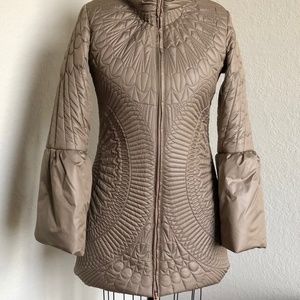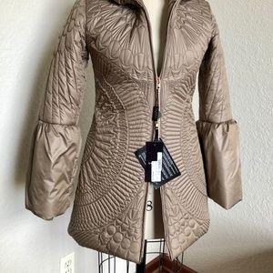 Beautifully quilted jacket, Byblos, made in Italy, NWT, fitted with bell puffed sleeves, puffed high collar, zip side pockets, champagne color. Length 32’, sleeves 24,5’, chest 18’, waist 16’. Warm and lightweight. Never worn. Size Small.