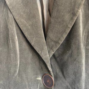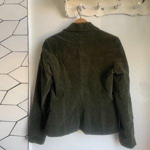 Bye designer army green velvet blazer jacket with large, unique brass button