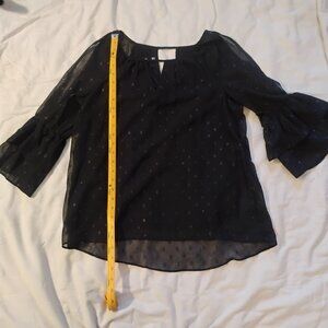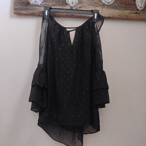 Byer M Black Sheer Chiffon Blouse Metallic Dot Pattern Open Shoulder Tiered Bell
