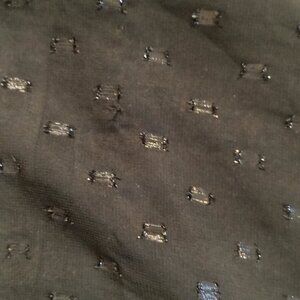 Elegant black chiffon blouse by Byer (size M) featuring a metallic dotted texture that catches the light beautifully. Designed with open shoulder cutouts, tiered bell sleeves, and a flowy high-low hem for a soft, feminine silhouette. Lightweight and semi-sheer with a subtle shimmer — perfect for date night, holidays, or a night out.