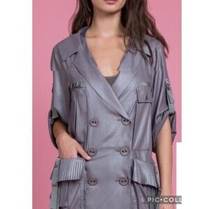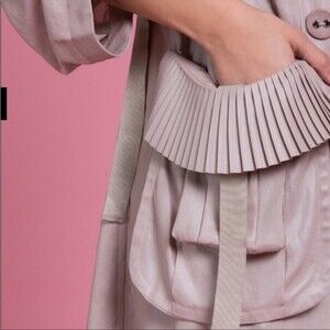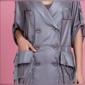 Softly structured lightweight double breasted trench. Drawstring back to wear loose with layers underneath or tight like a blazer. Sleeves have D rings for adjustable length. Pleated pockets with additional inside pockets. Deep V neckline. Original price $685.