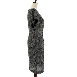 Fitted short sleeve V-neck knee length collared pencil dress. Made of a black & white open knit fabric. Deep V neckline. Buttons down the lower portion with 1 clasp. 2 front faux pockets. Lining at the skit portion - semi sheer / open knit at the top portion. Short batwing style sleeves.