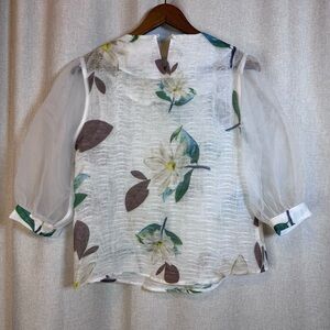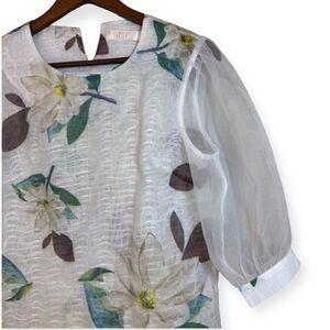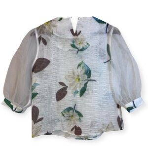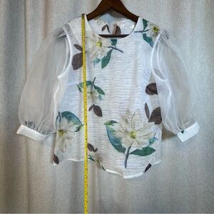 Elevate your style with the White Floral Women's Top. Featuring delicate floral patterns and sheer sleeves, this top is perfect for any occasion.