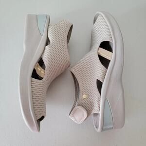 Tags: Bzees sandals, stretchy summer shoes, comfy wedges, washable shoes, travel sandals, walking wedges, beige comfort shoes, breathable stretch fabric, size 11 women, slip-on sandals
