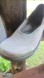Women's demi wedge or flat comfort shoe. Tannish beige color. Stretchy fabric upper. Rubber sole. Size 9.5. Pre-owned with light give to one of the seams at the interior highlighted in photo.