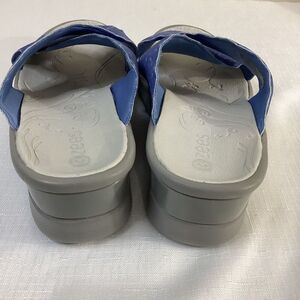 Slide on sandal with blue fabric upper and gray rubber outsole. Size 8.