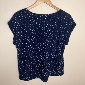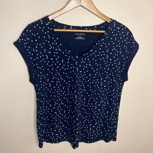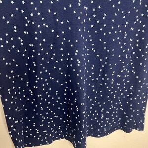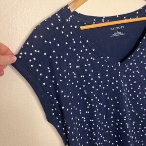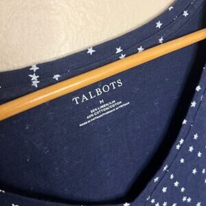 Talbots Navy Star Print Cap Sleeve Tee Medium. Preowned and in great condition. Cute tee with stars all over, perfect for 4th of July. Light weight and comfy. Please see all photos. Approx measurements in pictures.