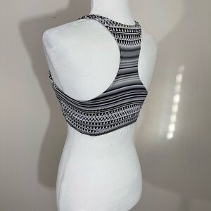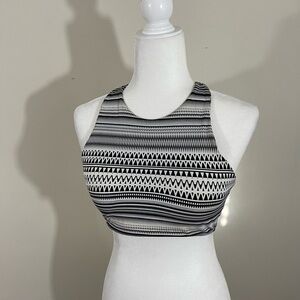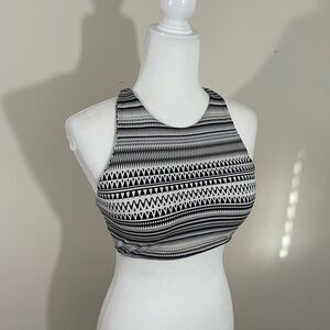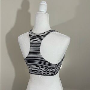 A sport crop style top in a black and cream design. The top is a little longer than a sports bra Racerback Very nice. No visible flaws. Any questions please ask. Will answer questions as soon as possible. G
